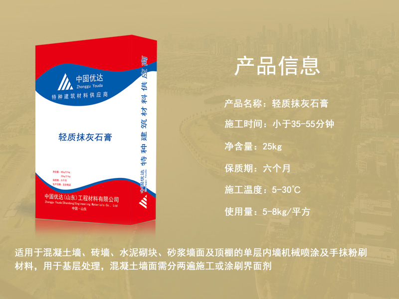 轻质石膏抹灰砂浆也叫做轻质抹灰石膏、轻质粉刷石膏,是以高纯度的半水脱硫石膏为主要胶凝材料,加入无机轻集料和适量的保水剂、缓凝剂等外加剂,经工厂预混制成的成品抹灰石膏。可广泛取代传统的水泥砂浆找平,用于室内建筑内墙和楼板的抹灰找平是建筑内墙以及顶板常用的一种抹灰材料,可以代替水泥以及石灰砂等,在适用性非常广泛,适用于任何墙体,克服传统抹灰的缺点,而且这种抹灰粘接力非常的强,能够与任何基材进行粘接,不会受到厚度的限制。在流动性以及饱水性上也是非常的,可以在0度进行施工,这种石灰膏环保无味、抗裂性效果好,具有保温隔热的效果,能够调节室内的湿度、干度方便施工,节省工期和界面处理的工序以及材料使用,苏州轻质粉刷石膏,墙面冲筋找平。
